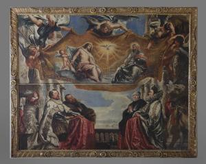 L'insieme si compone di tre dipinti, ognuno con propria cornice, che in origine facevano parte di un'unica, grande pala d'altare. Sono dunque da considerarsi frammenti della più grande opera originale. Il frammento maggiore, con "La famiglia Gonzaga in adorazione della Trinità", è a sua volta il risultato della ricomposizione dei due frammenti di maggior rilievo iconografico (la famiglia Gonzaga - invn. 6847 - e la Trinità - invn. 6846) assieme ad alcuni altri non immediatamente contigui, ma pure parte della grande pala originale. I tre frammenti appartengono ad enti diversi: il maggiore, di cui sopra, al Comune di Mantova; il frammento con "L'alabardiere" è di proprietà statale; il frammento con il "cagnolino" al Museo di Castel vecchio di Verona.