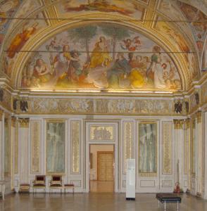 - NOTIZIE STORICO CRITICHE Nell'estate 1601, prima di partire per la sua terza spedizione in Ungheria, Vincenzo I Gonzagha (1562-1512) diede principio a una nuova "fabbrica di Corte Vecchia". Era prevista la ristrutturazione della quattrocentesca Domus Nova con l'aggiunta di nuovi fabbricati. Ne risultò il nuovo grandioso Appartamento Ducale. L'architetto Antonia Maria Viani - di origine cremonese, giunto a Mantova nel 1592 dopo un'esperienza artistica nella raffinata corte bavarese di Guglielmo V Wittelsbach - ricavò monumentali stanze riducendo il numero dei piani interni della costruzione fancelliana alla quale addossò "il salon quadro dove si balla" - la grande sala degli Arcieri - e un loggione, fondato nel 1602, presto trasformato nella galleria chiamata dal tardo Settecento degli Specchi. Le decorazioni pittoriche risalgono all'epoca del duca Ferdinando Gonzaga (1587-1626) e sono databili attorno al 1618. La galleria costruita dal padre ebbe la più vasta decorazione pittorica mai eseguita in palazzo, ispirata alla celebrazione delle scienze e delle arti, con figure allegoriche tratte dell'Iconologia di Cesare Ripa. Nei due grandi lunettoni alle testate vennero dipinti il Parnaso, dove assieme ad Apollo e alle Muse compaiono ritratti di poeti (si riconoscono almeno Dante, Petrarca, Boccaccio, Ariosto e Tasso) e l'Allegoria delle Arti liberali. Sulle lunette della lunga parete interna e nelle due parti estreme della volta si susseguono immagini di Virtù. Concordia, Umiltà e Munificemza sono dipinte nel primo tratto di volta; Eloquenza, Benignità, Immortalità, Acutezza d'Ingegno, Magnanimità, Affabilità e Liberalità trovano posto nelle lunette, mentre Innocenza, Felicità eterna e Filosofia (?) concludono la serie al capo opposto. La parte centrale della volta è occupata da un Concilio degli Dei, con ai lati il Carro della Notte e il Carro del Sole. Sembra ovvio leggere nella estesa decorazione affrescata una glorificazione delle "virtù" del duca, espressamente richiamato dall'immagine del sole, presente nella sua impresa col motto "Non mutuata luce". La magniloquente realizzazione si colloca entro il secondo decennio del Seicento. Solo nel 1618 il colto Ferdinando ottenne da Guido Reni la partecipazione degli allievi Francesco Gessi e Giangiacomo Sementi. Un terzo pittore, il tedesco Carlo Santner, appose la sua firma nell'Allegoria delle Arti Liberali; altri artisti forestieri erano ospiti a Mantova in quel periodo a spese della corte: oltre ai bolognesi sono ricordati pittori milanesi, un romano e un indoratore bresciano, che sicuramente avranno partecipato alla grandiosa impresa. La distinzione delle mani presenta tuttavia difficoltà non facilmente sormontabili. Caratteri reniani sono stati evidenziati da Angelo Mazza nel Concilio degli Dei e nell'Innocenza; una distinzione più articolata è stata tentata recentemente da Stefano L'Occaso che dubitativamente attribuisce le sette lunette a Jacopo Borbone, i grandi riquadri della volta a Sementi (il Concilio degli Dei), Gessi (il Carro della Notte) e a un ignoto pittore di formazione emiliano-fiorentina (il Carro del Sole), mentre due allegorie, la Filosofia e la Felicità eterna prossime al lunettone di Santner, spetterebbero a un pittore influenzato da Giovanni Baglione. Accreditando l'indicazione di Zaist, L'Occaso ritiene inoltre che Antonio Maria Viani abbia personalmente dipinto il Parnaso, nonchè le due allegorie attigue, Concordia e Munificenza. In ogni caso il prefetto delle fabbriche non dovrebbe essere ritenuto estraneo all'ideazione della colorata e vistosa decorazione pittorica, tutto sommato sufficientemente unitaria (BERZAGHI 2003, pp. 246-253).