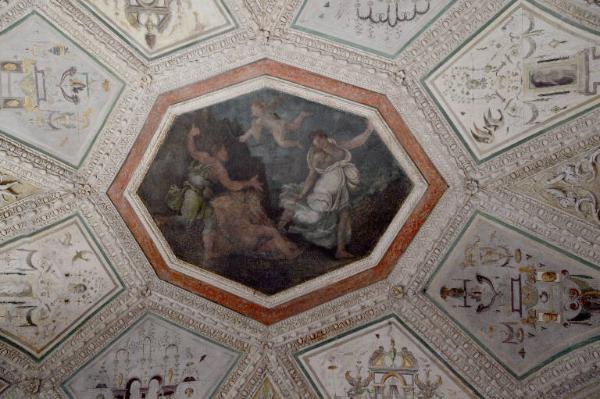 - NOTIZIE STORICO CRITICHE Nell'aprile del 1521, due anni dopo la morte di Francesco II Gonzaga, il primogenito Federico, che nel 1519 non aveva ancora raggiunto la maggiore età ed era salito al potere sotto la tutela della madre Isabella d'Este, assume a tutti gli effetti la guida dello stato. Il nuovo marchese passerà alla storia non solo per il suo opportunismo politico bensì anche per il suo talento di collezionista e committente ed in particolare per aver voluto a Mantova Giulio Romano, che per più di vent'anni detterà legge artistica alla corte dei Gonzaga, orientando il gusto dell'intera città sulle rive del Mincio. Sotto la sua stella, nei sogni del principe, Mantova sarebbe dovuta diventare una nuova Roma e, di conseguenza, uno dei centri propulsivi della maniera moderna. Secondo la tradizione degli studi, gli interventi di Giulio Romano in Palazzo Ducale possono essere distinti in due fasi. La prima, cominciata e conclusa nel 1531, riguarderebbe solo la sistemazione del doppio appartamento in Castello e la costruzione della Palazzina destinata alla sposa; la seconda, svolta tra il 1536 e il 1539, riguarderebbe, invece, la realizzazione del cosiddetto Appartamento di Troia in Corte Nuova e la fabbricazione dell'edificio della Rustica, di fronte alla loggia del nuovo appartamento di rappresentanza, al di là del Prato della Mostra (RAGOZZINO 2003, pp. 151-156).\nL'appartamento della Mostra è ricavato nella palazzina denominata la Rustica. La fabbrica proseguì anche sotto il breve ducato di Francesco III e poté dirsi conclusa solo nel 1561. Gli interni decorati a stucchi e pitture sono databili agli anni Sessanta del Cinquecento; appartengono cioè al ducato di Guglielmo e sono attribuiti a Fermo Ghisoni, Lorenzo Costa il Giovane e ad altri artisti mantovani diretti da Giovanni Battista Bertani, autore delle invenzioni. Alla Sala dei Pesci è annesso un piccolo studio con raffinatissimi stucchi raffiguranti il mito di Orfeo (Orfeo ammansisce gli animali col suono della lira, Orfeo e le Eliadi piangono la morte di Euridice, Orfeo nell'Ade suona la lira agli dei inferi, Orfeo straziato dalle Baccanti) e un dipinto ottagonale nel soffitto (Euridice inseguita da Aristeo è punta dal serpente) tra scomparti dipinti a grottesche (BERZAGHI 1992, pp. 51-53 ).\nOrfeo, il più famoso poeta e musicista che la storia abbia mai avuto, che non aveva eguali tra uomini e dei era figlio di Eagro, re della Tracia e della musa Calliope (o secondo altri di Apollo e di Calliope). Il Dio Apollo un giorno gli donò una lira e le muse gli insegnarono a usarla e divenne talmente abile che lo stesso Seneca narra, Ercole sul monte Oeta: "Alla musica dolce di Orfeo (...) le selve inerti si movevano conducendo sugli alberi gli uccelli; o se qualcuno di questi volava, commuovendosi nell'ascoltare il dolce canto, perdeva le forze e cadeva". Ogni creature amava Orfeo ed era incantata dalla sua musica e dalla sua poesia ma Orfeo aveva occhi solo per una donna: Euridice, figlia di Nereo e di Doride che divenne sua sposa. Il destino però non aveva previsto per loro un amore duraturo infatti un giorno la bellezza di Euridice fece ardere il cuore di Aristeo che si innamorò di lei e cercò di sedurla. La fanciulla per sfuggire alle sue insistenze si mise a correre ma ebbe la sfortuna di calpestare un serpente nascosto nell'erba che la morsicò, provocandone la morte istantanea. Orfeo, impazzito dal dolore e non riuscendo a concepire la propria vita senza la sua sposa decise di scendere nell'Ade per cercare di strapparla dal regno dei morti. Convinse con la sua musica Caronte a traghettarlo sull'altra riva dello Stige; il cane Cerbero e i giudici dei morti a farlo passare, riuscì a giungere alla presenza di Ade e Persefone. Una volta giunto al loro cospetto, Orfeo iniziò a suonare e a cantare la sua disperazione e solitudine e le sue melodie erano così piene di dolore e di disperazione che gli stessi signori degli inferi si commossero; le Erinni piansero e per la prima volta nell'oltretomba si conobbe la pietà come narra Ovidio nelle Metamorfosi (X, 41-63). Fu così che fu concesso a Orfeo di ricondurre Euridice nel regno dei vivi a condizione che durante il viaggio verso la terra la precedesse e non si voltasse a guardarla fino a quando non fossero giunti alla luce del sole. Orfeo, presa così per mano la sua sposa iniziò il suo cammino verso la luce. Durante il viaggio, un sospetto cominciò a farsi strada nella sua mente pensando di condurre per mano un'ombra e non Euridice. Dimenticando così la promessa fatta si voltò a guardarla ma nello stesso istante in cui i suoi occhi si posarono sul suo Euridice svanì, e Orfeo assistette impotente alla sua morte per la seconda volta. Una tradizione vuole che Orfeo dopo la discesa nell'Ade e viste le cose di laggiù inizio ad adorare Elio, che chiamava Apollo, e non più Dioniso e ogni mattina si svegliava all'alba per accogliere il sorgere del sole. Allora Dioniso istigò le Baccanti che decisero di ucciderlo. (www.elicriso.it)