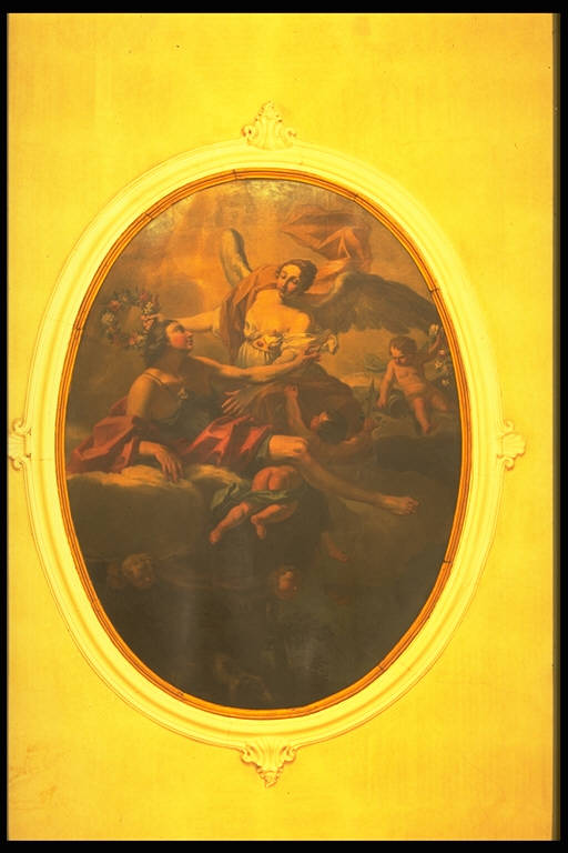 Dipinto affisso al soffitto. La cornice è doppia: lignea la struttura interna, in stucco quella esterna