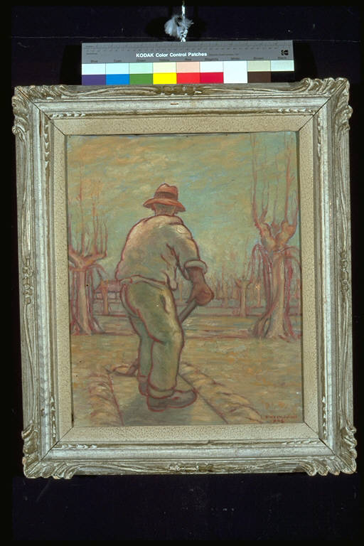 - NOTIZIE STORICO CRITICHE L'opera fu presentata fuori concorso alla Ia edizione del Premio Suzzara, nel 1948.\nSi tratta di un tipico esempio della produzione di Villani, incentrata sui personaggi e sui lavoratori della pianura mantovana: in questo caso, un contadino, ripreso di spalle, che mostra, nella vigoria del tratto e nella sottolineatura dei contorni, tutta la fatica , ma anche la devozione al suo lavoro. La luce della pianura lombarda viene resa magistralmente tramite la gamma cromatica che non presenta timbri accesi, ma toni che si compenetrano, e con l'insistenza nell'utilizzo del rosso come segno che crea i corpi e le strutture, in modo quasi grafico.\nL'artista nasce nel 1898 a Nogara (VR). Dopo la giovinezza trascorsa a Suzzara, dal 1930 si trasferisce a Milano, dove diviene presto pioniere dell'arte pubblicitaria e cinematografica. Sua è la promozione per l'azienda alimentare Motta, dei dolci tradizionali. Dal 1956 è direttore della pubblicità per la Carlo Erba. Inventa ,nel corso di tutta la sua attività professionale , varie combinazioni pubblicitarie e concorsi con le maggiori Case dell'epoca, tra le quali il concorso di "Miss Italia". Per tutta la vita rimene legato alla pianura e alla sua gente, alle sue occupazioni, ai suoi rituali, che incessantemente ripropone nelle sue opere pittoriche e grafiche, partecipando, dal 1927 , a mostre collettive e personali, italiane ed estere.