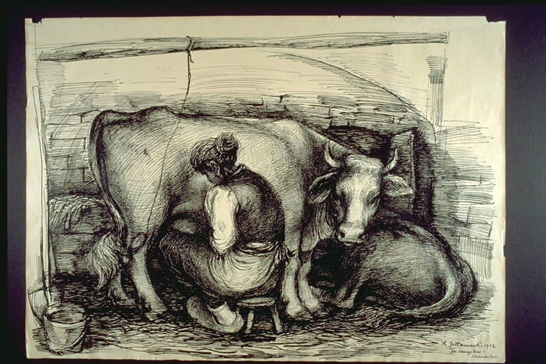 La mungitrice. Donna, di spalle, intenta a mungere una mucca