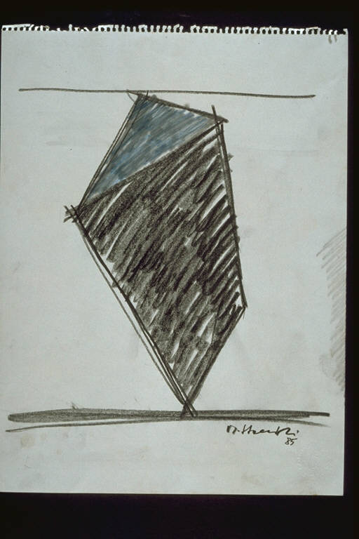 - NOTIZIE STORICO CRITICHE Si tratta del bozzetto di una delle installazioni a forma di cuneo, tipiche della produzione dell'artista.\nL'artista nasce a Volterra nel 1937. Inserisce le proprie creazioni geometriche e razionali negli ambienti cittadini sin dal 1972 (esposizoine di volterra). E' da sempre interessato a sintetizzare in un segno l'anima e il carattere dei luoghi che pratica. Fino alla metà degli anni Settanta le sue opere si presentano gremite di grossi spunzoni, rostri, cunei minacciosi; in seguito le forme giungono ad una maggiore essenzialità. Nel corso degli anni Ottanta le forme cercano di ingentilirsi e di farsi più aeree e leggere, e spesso predominano le linee curve.Inoltre, ora interviene anche il colore .Sue opere sono presenti nelle collezioni e nei musei all'aperto in Italia e nel mondo.