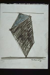 Studio. Elemento poligonale costituito da un trapezio campito con matita a carboncino e un triangolo campito con pastello blu