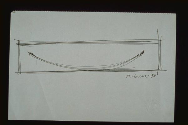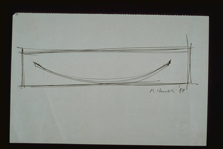 - NOTIZIE STORICO CRITICHE Si tratta del bozzetto di una delle installazioni a forma concava, tipiche della produzione dell'artista negli anni Ottanta.\nL'artista nasce a Volterra nel 1937. Inserisce le proprie creazioni geometriche e razionali negli ambienti cittadini sin dal 1972 (esposizoine di volterra). E' da sempre interessato a sintetizzare in un segno l'anima e il carattere dei luoghi che pratica. Fino alla metà degli anni Settanta le sue opere si presentano gremite di grossi spunzoni, rostri, cunei minacciosi; in seguito le forme giungono ad una maggiore essenzialità. Nel corso degli anni Ottanta le forme cercano di ingentilirsi e di farsi più aeree e leggere, e spesso predominano le linee curve.Inoltre, ora interviene anche il colore .Sue opere sono presenti nelle collezioni e nei musei all'aperto in Italia e nel mondo.
