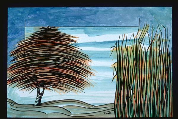 - NOTIZIE STORICO CRITICHE Il disegno si inserisce nella produzione più tipica dell'artista, proponendo la rappresentazione per lui classica dell'albero, affiancato dal canneto. Rossello eleva l'albero a simbolo assoluto dell'ambiente, della purezza, della natura riconquistata; ma una natura tutta particolare, mai esclusivamente veristica, che produce una sorta di "paesaggio mentale". Gli elementi naturali sono si perfettamente riconoscibili, ma al tempo stesso provenienti da angoli remoti, da cui provengono anche i colori intensissimi.\nL'artista nasce a Savona nel 1927. Pittore, scultore e ceramista. Le prime esperienzee materiche ed informali le compie ad Albissola Mare. Dal 1955 si stabilisce a Milano. Nel 1957 partecipa alla mostra "Arte Nucleare" alla Galleria San Fedele. Negli anni Sessanta torna alla figurazione su vari aspetti della società conemporanea: le tecnologia, il rapporto uomo-macchina, l'alienazione, il consumismo. Dal 1967 comincia anche ad eseguire sculture in marmo e in bronzo. Negli anni Settanta perviene ad un linguaggio figurativo che risente della pittura metafisica e cubista. Negli anni Ottanta ha prodotto una serie di paesaggi di città americane in cui predomina il tema dello smog, affiancata alla serie degli "alberi". Nel 1990 realizza la scultura "L'Albero della speranza" all'ingresso della sede CEE a Bruxelles.