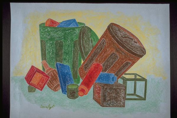 Due bidoni dei rifiuti; a terra, vari oggetti e cubi multicolori