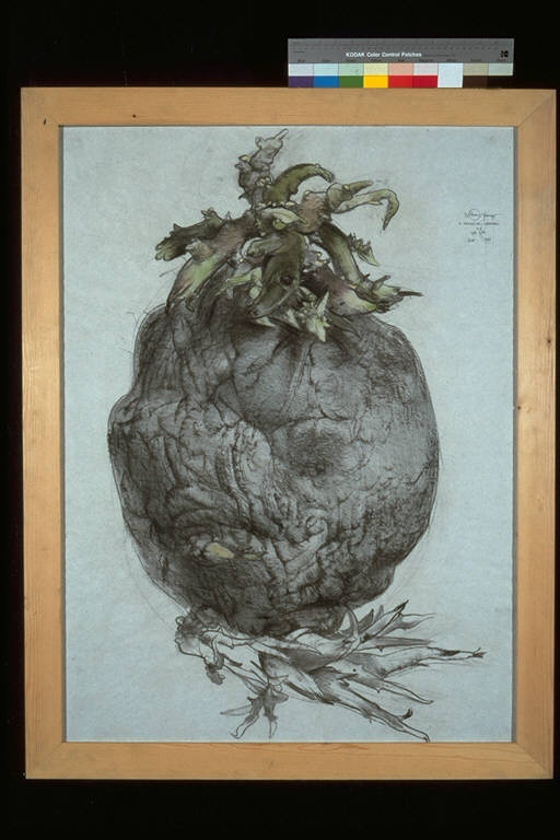 La patata con i germogli. Grande patata con radici e germogli