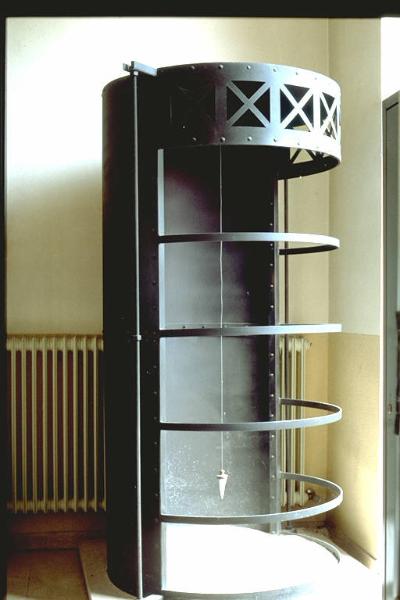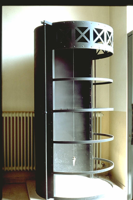 L'inevitato. Struttura di forma cilindrica, con lato di fondo chiuso, e cerchi in lamiera sulla fronte All'interno pende un cuneo