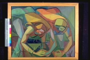 - NOTIZIE STORICO CRITICHE Al I° Premio Suzzara (1948) vinse 30 kg di salumi assortiti.\nDefinizione delle forme tendente al geometrico e disposizione dei colori in senso antinaturalistico. Stilisticamente l'opera appartiene alla corrente neo-cubista, presente in una parte dell'arte figurativa italiana del secondo dopoguerra.\nNacque a Medicina (BO) nel 1913 da famiglia di operai. Si trasferisce a Bologna nel 1930 e qui si diploma ad una scuola d'arte frequentando i corsi serali. Inizia ad esporre nel 1933. Nelle opere degli anni '40 si accosta all'espressionismo italiano (es. Cristo percosso, 1944; Mascherata, 1943: Tragedia Marzabotto, 1945). Finita la guerra entra a far parte di un gruppo di artisti che diedero vita alla Galleria ed alla rivista "Cronache". Nel 1946 tiene la sua prima personale. Nel 1948 è fra gli organizzatori dell'importante rassegna "Alleanza della Cultura" tenuta al Palazzo del Podestà di Bologna, dove le opere degli artisti del Fronte Nuovo delle Arti, che avevano già esordito alla XXIV Biennale di Venezia, vengono aspramente criticate da Palmiro Togliatti. Borgonzoni partecipa a questa mostyra con opere di impostazione neocubista e neopicassiane. Nei primi anni '50 approfondisce il suo impegno in ambito realista. La sua pittura si fa più fluida e problematica, inquieta e densa di pathos cromatico e formale. Nelle opere degli anni '60 riprende spunti di matrice espressionista ed esistenziale (ciclo di opere dedicate al Concilio Vaticano II). Nelle opere degli anni '80 realizza un intreccio tra mito classico e trdaizione ottocentesca (citando la pittura di Pellizza da Volpedo), ridando immagine alle utopie del socialismo romantico.