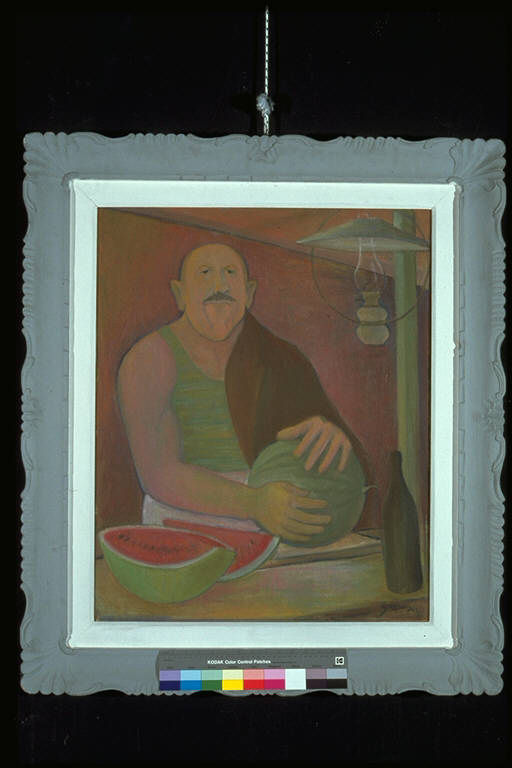 - NOTIZIE STORICO CRITICHE Alla II edizione del Premio Suzzara (1949) vinse 1000 mattoni e un taglio di abito.\nL'opera caratterizzata da una struttura compositiva ordinata, e dal segno "nascosto" del pennello sembra ricollegarsi al "neoclassiccismo" di Valori Plastici. Il modo con cui è rappresentato il venditore di cocomeri, invece, rivela l'inenzione da parte dell'artista di mettere in risalto gli aspetti inquietanti di una realtà apparentemente innocua, secondo il modello offerto dalla corrente artistica tedesca affermatasi sempre negli anni '20 e chiamata nuova oggettività (Dix, Grosz, Dravinghausen, Scholz). Tavolozza impostata su tonalità chiare.\nL'artista è in quegli anni attivo a Verona.