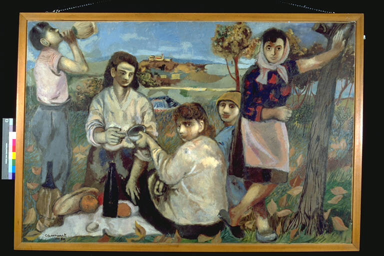 - NOTIZIE STORICO CRITICHE Al VII° Premio Suzzara (1954) vinse un frigorifero e un soggiorno alla fiera di Milano.\nUso di un linguaggio stilistico avvicinabile, per l'uso di un tessuto coloristico opaco e antitonale e per il modo di costruire solidamente le forme, alla tecnica pittorica del primo Cèzanne.\nL'artista è nato a Genova nel 1924. Tra la fine degli anni Quaranta ed il decennio successivo realizza le sue prime opere che sono un'inquieta rappresentazione dei contenuti del neorealismo. La sua prima personale è del 1954 (Brescia). Nel '56 è alla Biennale di Venezia. Si trasferisce a Milano dove si avvicina a Fontana, Manzoni e Rotella. Rivisita con ironia i miti della storia dell'arte e dell'arte popolare. Negli anni Sessanta espone di frequente all'estero. Si interessa profondamente di cinema e teatro. Nell'89 vince il concorso per la decorazione del Teatro Carlo Felice di genova. Dal'94 si reca spesso in Irlanda e lavora nella Contea del Kerry.
