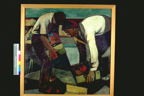 - NOTIZIE STORICO CRITICHE Al V° Premio Suzzara (1952) vinse L. 50.000\nLe figure sono descritte attraverso volumi pieni, ed un disegno regolare e semplificato. \nL'artista è nato a Genova nel 1924. Tra la fine degli anni Quaranta ed il decennio successivo realizza le sue prime opere che sono un'inquieta rappresentazione dei contenuti del neorealismo. La sua prima personale è del 1954 (Brescia). Nel '56 è alla Biennale di Venezia. Si trasferisce a Milano dove si avvicina a Fontana, Manzoni e Rotella. Rivisita con ironia i miti della storia dell'arte e dell'arte popolare. Negli anni Sessanta espone di frequente all'estero. Si interessa profondamente di cinema e teatro. Nell'89 vince il concorso per la decorazione del Teatro Carlo Felice di genova. Dal'94 si reca spesso in Irlanda e lavora nella Contea del Kerry.