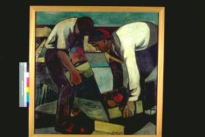 Fruttivendoli. Due uomini, chinati, raccolgono cassette colme di frutta