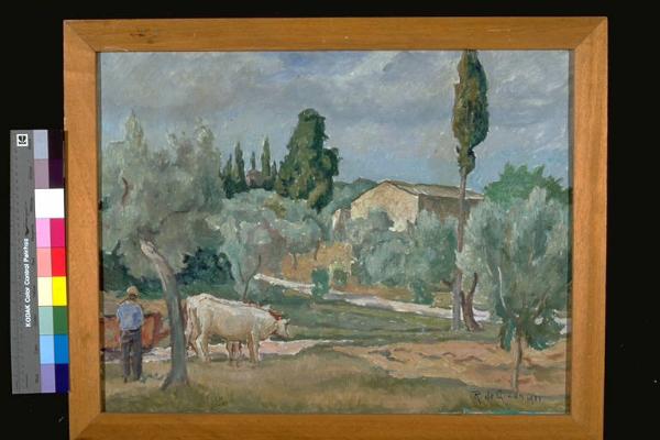 Carro toscano. Paesaggio campestre con carro trascinato da buoi e contadino