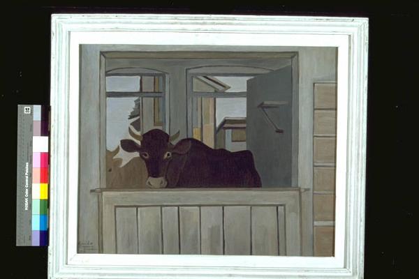La mucca. Mucca all'interno di una stalla, con porta divisoria chiusa