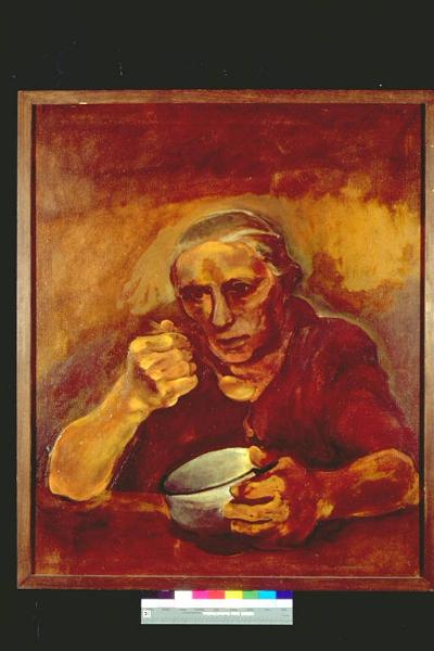 Contadina che mangia. Figura femminile, a mezzo busto, mentre mangia da una scodella con un cucchiaio