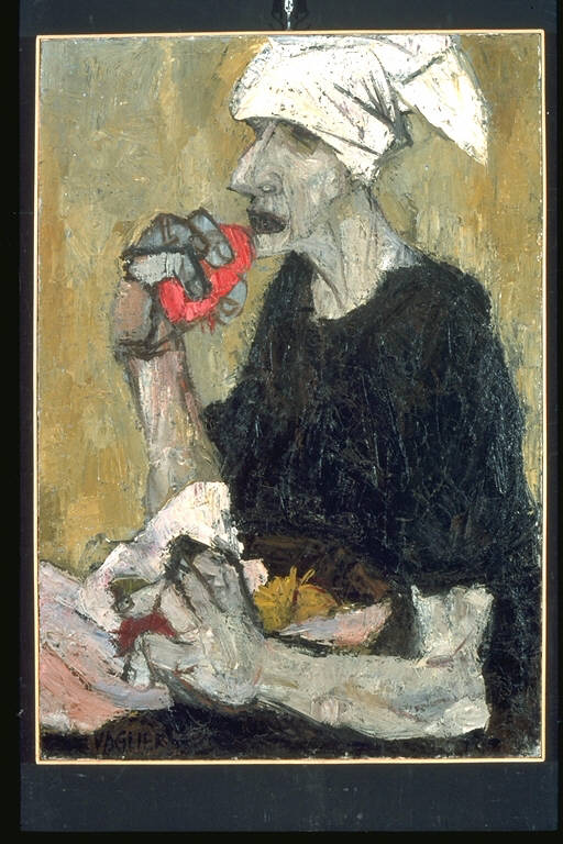 - NOTIZIE STORICO CRITICHE Al X° Premio Suzzara (1957) vinse una pompa centrifuga.\nLo stile è caratterizzato da un disegno angoloso, da una forte espressività del volto e delle mani e dall'uso di una gamma cromatica ridotta, essenzialmente, al bianco e al nero. La composizione nel suo complesso risulta scarna. L'opera, vicina alle soluzioni formali dell'epresionismo tedesco, si inserisce nel clima del realismo esistenziale.\nL'artista nasce a Treviso nel 1929. Nel 1947 si stabilicse a Milano, dove frequenta l'Accademia di Brera e conosce BAnchieri, Ceretti , Guerreschi e Romagnoni con i quali verso la metà degli anni Cinquanta dà vita al gruppo del Realismo Esistenziale. La sua prima personale è del 1956 alla Galleria Pater di Milano, presentata da M. De Micheli. Nel 1957 tiene un'altra personale alla Galleria Bergamini di Milano, che inaugurerà una lunga serie di mostre personali e colletive, in Italia e all'estero ( Buenos Aires, Berlino), e di partecipazioni a Premi (Biennale di Venezia, Quadriennale di Roma, Premio Suzzara, Premio Lissone, Biennale di San Paolo del Brasile, ecc. ecc.). I soggetti delle sue opere sono accomunati da una grottesca deformazione, il più delle volte rappresentano gli aspetti più scabrosi della realtà urbana (fognature, televisori, violenze sull'uomo, repressi ecc.). Verso la fine degli anni Cinquanta, le sue immagini si fanno sempre più essenziali e la sua pittura si avvicina ai modi dell'astratto - informale.