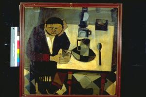 La sera dell'operaio. Figura maschile seduta, con in mano un bicchiere, appoggiata ad un tavolo