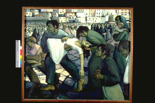- NOTIZIE STORICO CRITICHE Al XXII° Premio Suzzara (1969) vinse il vitello.\nOpera che, nell'ambito dello stile realista, è di diretta denuncia sociale, enfatizzando le dure condizioni dei disoccupati, rappresendoli con visi dai colori lividi e drammatici, e incentrando l'azione attorno al cadavere femminile. La folla in secondo piano è via via sempre meno caratterizzata. Il paesaggio architettonico sullo sfondo è reso con spazialità e prospettiva canoniche.