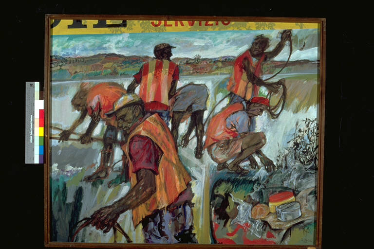 - NOTIZIE STORICO CRITICHE L'opera vinse £. 105.000, un prosciutto, un mobile, kg. 30 di pasta ed un servizio per dolci al Premio Suzzara 1967. Essa utilizza lo stile realista per intenti di denuncia sociale: vengono unfatti sottolineate le condizioni di di fatica dei lavoratori delle autostrade , enfatizzate da un loro abbruttimento anche fisico. La pennellata è veloce ed insistita in alcuni punti, specialmente nella figura del lavoratore in primo piano, la cui figura ed abbigliamento sono resi a mezzo di diversi livelli di colore. Le figure in secondo piano sono invece più sfumate e di esse sono rilevanti solo i movimenti. Il paesaggio è reso con cura, ma con uno stile quasi impressionistico.\nL'artista nasce a Milano nel 1933. Studia pittura e affresco alla Scuola d'Arte del Castello, e frequenta l'Accademia di Brera, allievo di Carpi e Usellini. Dalla seconda metà degli anni Cinquanta partecipa a concorsi e a mostre collettive, vincendo numerosi premi per la pittura e per il disegno. Allestisce la prima personale nel 1961 ,alla Galleria Montenapoleone di Milano. Fino al 1970 il tema dominante della sua figurazione è il paesaggio; in seguito, il dato di natura si risolve in un breve accenno. Un ulteriore sviluppo di questa ricerca, arricchita anche da talune acquisizioni della Op art, porta, negli anni Ottanta, ad una ricerca sul colore, sempre più instabile, che sfuma in un altro a lui simile. I risultati di questa esperienzasi avvertono anche nella produzione figurativa degli anni Novanta, che affianca quella astratta.