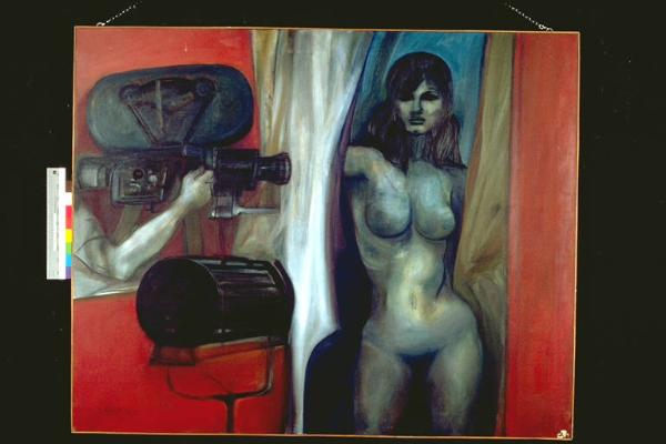 , 2 bidoni di Tintal, confezione , liquori vari, confezione , un bruciatore per stufa e un libro.\nOpera inquadrabile all'interno della linea napoletana del realismo: la modella e la cinepresa diretta su di lei sono rappresentate nel loro immediato impatto visivo, tramite una resa dai toni cromatici decisi, ma sfumati, quasi ad avvolgere la rappresentazione in un'aura di intimità. - TIPOLOGIA SCHEDA Opere/oggetti d'arte