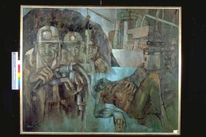- NOTIZIE STORICO CRITICHE Al XXI° Premio Suzzara (1968) vinse L.60.000, un prosciutto, una scarpiera, un tostapne, 32 bottiglie di lambrusco, un tritacarne, un tritaverdura, una affettatrice, un accappatoio, tovaglia, tovaglioli e piatti per 8 persone, un aspirapolvere, 50 kg di farina, 10 kg di detersivo, un impermeabile e un box per bambino.\nL'opera, con modi espressionistici, si riallaccia al realismo sociale, sottolineando a mezzo di una pennellata quasi cezanniana la durezza e la fatica del lavoro degli operai, ed enfatizzando il loro dramma tramite la potente figura del ferito in primo piano, immerso in una livida luce verde-azzurra, maschera di dolore e di sofferenza.