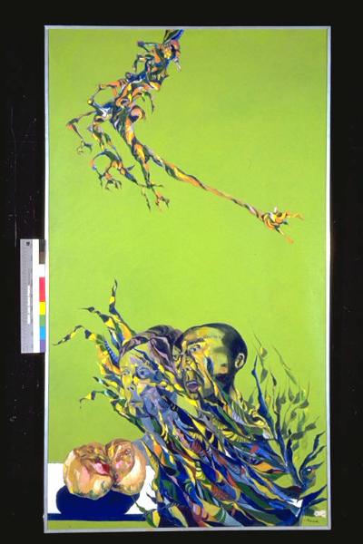 - NOTIZIE STORICO CRITICHE Al XXI° Premio Suzzara (1968) vinse L.100.000, una forma di formaggio grana, federe per macchina <850>, un trapano elettrico, due paia di scarpe, una valigia, 16 bottiglie di birra, un ombrellone, un termometro, mattonelle per pavimento, una gabbia di polli selezionati, un pallone, una racchetta da tennis.\nNell'opera sono presenti sia elementi espressionistici, dati dalla durezza di espressione e di tratti delle due teste, che elementi che si richiamano al futurismo, sia nelle forme avviluppate che nell'alternanza caleidoscopica dei colori degli elementi che in basso paiono fitomorfi, ma che, pur restando simili, in alto si trasformano quasi ad assumenre parvenze mostruose. Dal pop deriva invece la tonalità verde acido di sfondo.\nL'artista è nato a Brescia nel 1932. Inizia ad esporre nel 1956 allestendo, su invito, cinquanta personali in galleria d'arte italiane ed europee. I suoi dipinti e le sue acqueforti sono stati esposti in importanti rassegne nazionali ed internazionali. La sua opera è sempre connotata da una natura affascinante ed inerte, in rapporto alla quale tutto può accadere o essere accaduto: caso tipico di espressione in cui il distacco diviene catalizzatore di giudizio.