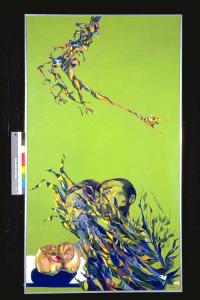 Il costo del pane. Su di uno sfondo verde, una forma di pane e due teste sono come avvinghiate da elementi multicolori fitomorfi Simili elementi anche in alto