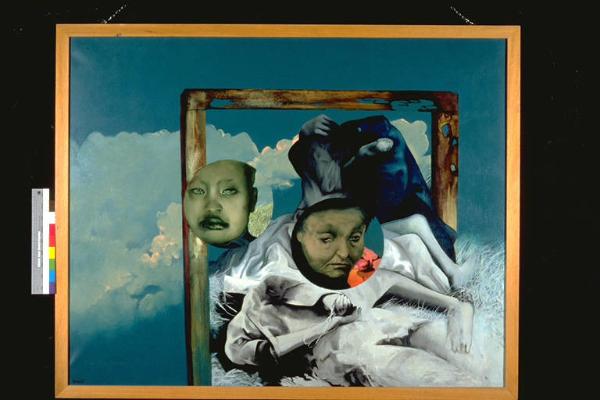 Mirino tra gli stracci. Corpi umani su un prato inquadrati da una cornice; due tondi con ritratti: il primo di un fanciullo, il secondo di una anziana
