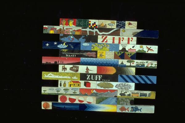 - NOTIZIE STORICO CRITICHE L'opera fu donata dall'artista in occasione della mostra del 1983 "Otto giovani artisti in galleria".Gli svariati soggetti rappresentati su ciascun tassello rimandano a suggestioni dall'arte infantile, con scelte tipiche dell'immaginario dei bambini, ma, nelle scritte, riporta ad una influenza del fumetto; sono inoltre evidenti riprese dall'op-art in certi tasselli.