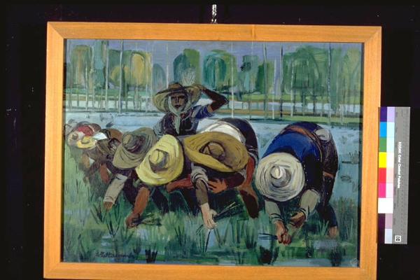 Mondine. Scena di lavoro di mondine, una delle quali è alzata, mentre le altre sono chinate