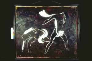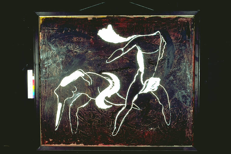 - NOTIZIE STORICO CRITICHE Al XXXII° Premio Suzzara (1992) vinse il premio acquisto.\nL'opera denota una profonda cultura figurativa classica, che va dal modello più immediato,l"Atalanta ed Ippomene" di Guido Reni, la cui composizione viene ripresa delineando solamente i contorni bianchi delle due figure, al rinvio ai vasi dell'epoca pre-ellenistica , a figure nere stagliate sul fondo, che in questo caso è pur'esso nero. Il corpo diventa qui l'elemento cardine della rappresentazione, ma con una tragicità che rinvia a Bacon, riprendendone le forme lacere ed i frammenti gloriosi.