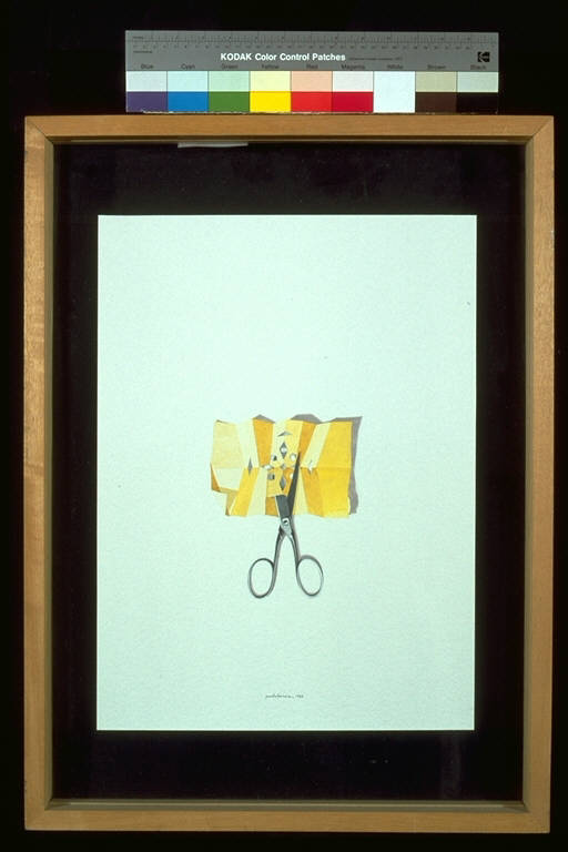 - NOTIZIE STORICO CRITICHE L'opera perviene dalla personale del 1982.\nSi tratta di una tipica realizzazione di quest'artista, che recupera oggetti del quotidano , li decontestualizza, e li isola sulla superficie del foglio bianco, secondo un procedimento che riporta l'oggetto a fotogramma, per poi ritrarlo a mezzo di una pittura quasi miniaturizzata, con il piacere di un lungo e paziente lavoro pittorico.\nL'artista è nata a Ferrara nel 1945. La prima personale è del 1973 alla Galleria cortevecchia. Nel 1980 ha tenuto una personale al Centro Attività Vvisive. Ha insegnato Ed. Artistica a Padova e per molti anni ha diretto una scuola di pittura a Ferrara. Ha realizzato mostre personali e collettive a Bologna, Budapest, Ferrara, Leningrado, Mestre, Mantova, Milano, Padova, Ravenna, Roma, Sarajevo, Swansea (GB), Torino, Trieste.