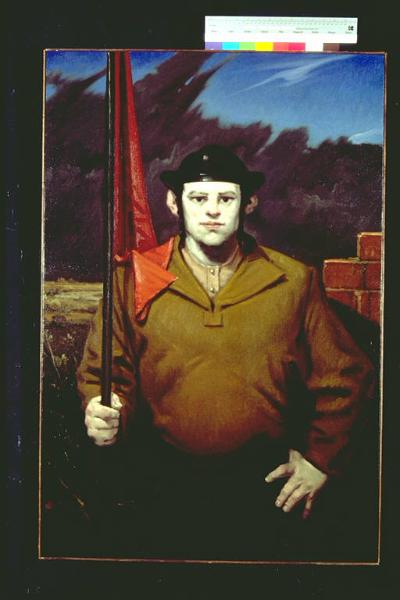 - NOTIZIE STORICO CRITICHE L'opera vinse , ex aequo con gli artisti Leddi, Mulas e Vimercati, il Premio Suzzara 1995.\nRitratto di un realismo modellatosi sulla grande tradizione della storia dell'arte. L'umanità del portabandiera è sottolineata dalla massa enorme della figura, che invade tutto lo spazio a disposizione e si delinea, prepotente, accompagnata da due soli altri elementi distintivi: la bandiera, rossa, che cade sulle spalle del giovane, fondendosi quasi con lui, e l'elmetto, che, con il bagliore riflesso, fa convergere lo sguardo del riguardante sul volto.
