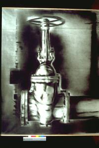 Giunto meccanico, con azionamento a ruota; lo sfondo è un paesaggio industriale