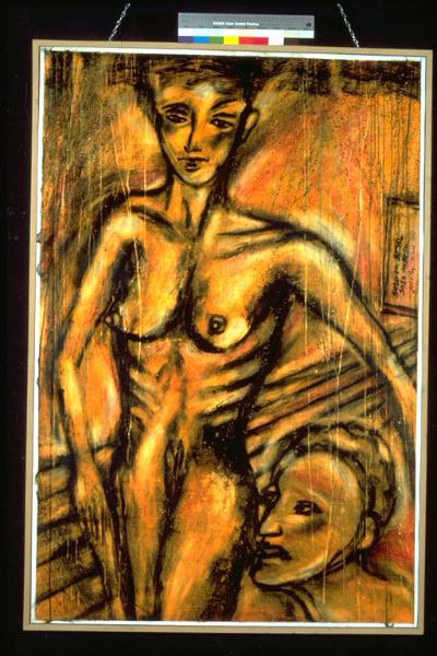 - NOTIZIE STORICO CRITICHE Al XXXVIII° Premio Suzzara (1998) vinse il premio acquisto ex-aequo con Crociani, Ibanez, Chiesi.\nOpera che lascia emergere un evidente erotismo, trattato però in chiave onirica e fantastica, acuito anche dai toni caldi utilizzati. L'ispirazione che l'autore trae da certa pittura e garfica dell'avanguardia tedesca, ad esempio Dix o Grosz, emerge dal trattamento insistito dei contorni e dalla drammaticità della situazione e dell resa del corpo femminile, anche se addolcito dal viso della donna stessa. Un senso di caducità e di disfacimento è conferito dal trattamento dello sfondo, corrusco, e dalle colature di colore che investono anche le figure. \nL'artista nasce a Buenos Aires nel 1939. Dopo gli studi artistici e d'architettura in Argentina, inizia la serie d'incisioni "Los Inventos" del 1972 e "La condizione umana" del 1974. Nel 1976 si stabilisce a Milano. Del 1985 è la sua prima antologica in Italia, al Collegio Cairoli di Pavia. Seguono numerose mostre internazionali. Nel 1990 è a Berlino, membro ella giuria della IX Triennale Intergrafik.
