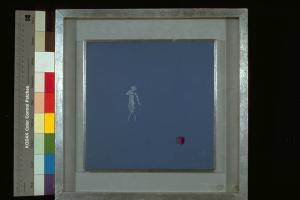Fauno. Un piccolo fauno, sospeso in una campitura azzurra, guarda un cubo viola