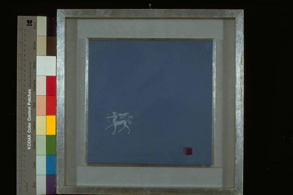 - NOTIZIE STORICO CRITICHE Da personale 1983.Opera nella quale è evidente la suggestione della Metafisica così come del Surrealismo alla Magritte: il tono dominante, tipico della produzione di Calzetti, è l'azzurro, entro cui sono immersi, immoti e silenziosi, il centauro, simbolo di una mitologia astrologica classicheggiante, ed il cubo, elemento concettuale che, attraverso lo stacco cromatico del viola, riporta ad equilibri preziosi e fragili.