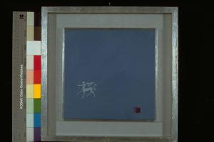 Centauro. Centauro con arco e freccia sospeso in una campitura azzurra In basso a destra un cubo viola