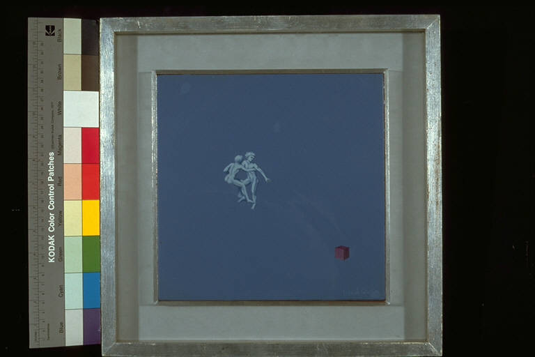 - NOTIZIE STORICO CRITICHE Da personale 1983.Opera nella quale è evidente la suggestione della Metafisica così come del Surrealismo alla Magritte: il tono dominante, tipico della produzione di Calzetti, è l'azzurro, entro cui sono immersi, immoti e silenziosi, i due mitici eroi Castore e Polluce, simbolo di una imagerie mitologica classica, ed il cubo, elemento concettuale che, attraverso lo stacco cromatico del viola, riporta ad equilibri preziosi e fragili.