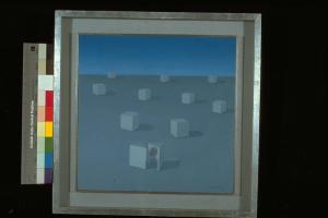 - NOTIZIE STORICO CRITICHE Da personale 1983.Opera nella quale è evidente la suggestione della Metafisica così come del Surrealismo alla Magritte: l'immagine è scompartita da una netta linea di demarcazione terra - aria, generando due campiture: l'una azzurra, a rendere un cielo immoto e soseso; l'altra digradante nei toni del grigio entro cui sono collocati, seguendo un preciso schema geometrico, i cubi bianchi, simboleggianti le pietre che Deucalione getta alle proprie spalle per ripopolare il mondo dopo il diluvio. Ecco che Deucalione stesso , artefice della rinascita del mondo, compare solo come ombra , proiettato al centro di uno dei due prismi centrali, presentandosi, metafisicamente, come vero e proprio demiurgo , suggerito ma non mostrato. Tutta la composizione denota la profonda suggestione di una imagerie mitologica classica, che sempre ritorna nelle opere dell'artista.