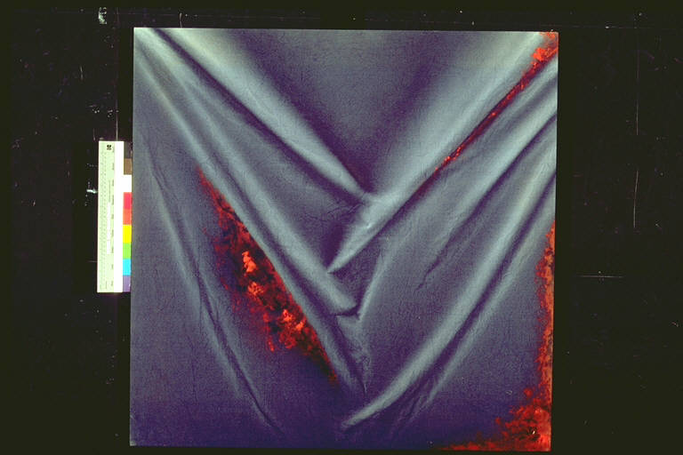 - NOTIZIE STORICO CRITICHE Opera che perviene alla galleria dalla personale tenutasi nel 1985.\n.Le pieghe, presentate iper-realisticamente, sono il risultato di una tensione di forze che agiscono qui in direzioni sparse, come le forze conosciute ed ignote della natura. L'intonazione di fondo è blu, il colore che sempre ritorna nelle opere dell'artista, colore dell'assoluto, dell'immateriale, che si visualizza nel drappo, che viene enfatizzato da pennellate rosse che, come fiamme, che consumano la pittura dall'interno, simbolo di uno spasmo creativo, che va ben al di là dell'apparente sospensione temporale e ricerca analitica. \nL'artista è nata a Biella vive e lavora a Torino. Si è diplomata al Liceo Artistico di Torino. Negli anni Settanta si è confrontata con temi quali la legge di gravità, discesa al basso, pesantezza della materia contrapposte a presenze aeree. Dal 1980 ha iniziato la ricerca sui fondi blu, presto animati di pieghe e drappeggi dipinti, a cui quest'opera appartiene. Successivamente di è dedicata alla tecnica del legno dipinto, in un secondo momento tagliato. La sua ultima produzione si è rivolta alla tematica acquatica, trasparente e colorata.