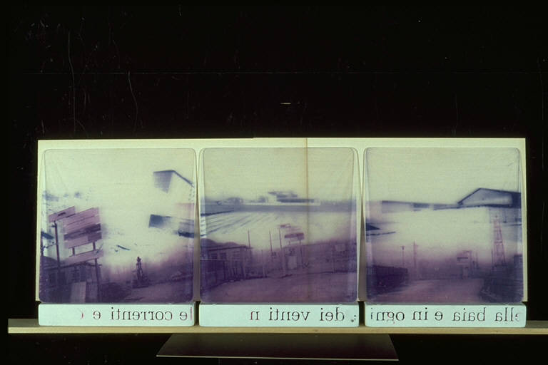 - NOTIZIE STORICO CRITICHE L' opera sostituisce la vincente "Ricominciare da", premiata al XXXVI Premio Suzzara del 1996, analoga per dimensioni, tecniche ed esecuzione.\nNell'opera si riflette un montaggio di frammenti di immagini prelevate con l'obiettivo fotografico nelle periferie urbane: capannoni, macerie, attrezzi da lavoro. Sono zone prive d'identità, in cui l'azione plasmante dell'uomo è temporaneamente sospesa, lasciando il campo alla periferia come giungla urbana. L'atmosfera lirica, sfumata, le colorazioni crepuscolari ed ovattate contribuiscono a diminuire il contrasto con le frasi, riportate significativamente al contrario, impresse sui supporti di ogni singola lastra: parole che narrano di baie, di venti e di correnti, un mondo sicuramente altro rispetto alle immagini presentate, un mondo evocato ed evanescente, come le parole stesse, i cui caratteri tendono a dissolversi ed a farsi trasparenti. Particolare è inoltre l'eleborazione tecnica che gli artisti utilizzano in quest'opera: una componente manuale, scultorea e pittorica, si assomma all'utilizzo dei nuovi mezzi tecnologici di elaborazione dell'immagine.\n Gianfranco Botto e Roberta Bruno sono nati a Torino, dove vivono e lavorano. Il loro legame artistico ha origine nel 1992. Fin dall'inizio il loro lavoro è imperniato sulla raccolta di immagini fotografiche scattate nelle periferie urbane. Le immagini vengono tagliate e ricomposte secondo un procedimento simile al montaggio cinematografico.\nIl loro rimaneggiamento è un momento fondamentale del lavoro: in tal modo gli artisti riescono a decontestualizzare i luoghi presentati che diventano sfuggenti ed enigmatici. I frammenti così costituiti sono inizialmente fissati su plexiglas, su finta pelle o ingranditi su carta e ritoccati a mano con colori acidi. Nel 1996 realizzano il primo "wall paper": foderano pareti o intere stanze con la tecnica dell'affissione. L'immagine è costituita da frammenti di 1000 o più fotocopie delle foto di architetture industriali, di edifici abbandonati, scattate nelle periferie delle città in cui si svolge la mostra. Nel 1998 compare nelle foto una figura umana, con il volto nascosto. Il risultato fi questi montaggi è la mancanza di definizione percisa del luogo. In questo stesso anno iniziano a lavorare con il video. La macchina fotografica è utilizzata come una cinepresa, centinaia di scatti sono montati al computer in dissolvenza incrociata.