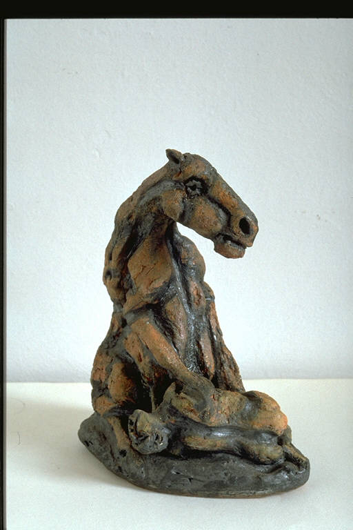 Cavallo seduto; sotto le sue zampe anteriori, figura umana schiacciata