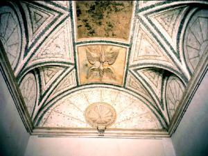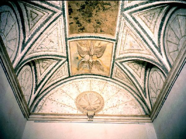 Volta e lunette dipinte con motivi vegetali e uccelli. Al centro il simbolo imperiale.