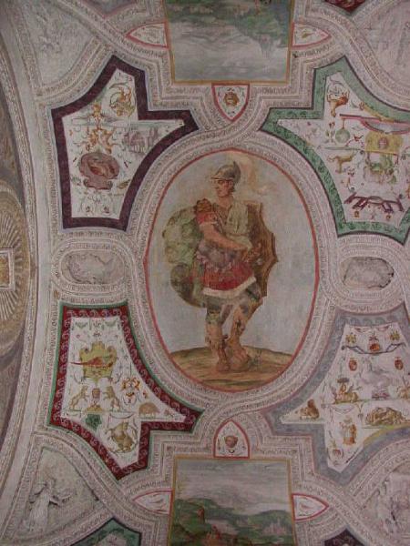 Volta dipinta a grottesche con ovale centrale raffigurante "Fetonte che guida il carro del sole" e ovali laterali raffiguranti "Mercurio" e "Marte". Il tutto entro cornici modellate in stucco. Sempre in stucco sono modellate teste poste di profilo e scene varie cui si alternano paesaggi dipinti. Nelle zone laterali si notano quattro bassorilievi con episodi della storia romana: Muzio Scevola, Decio Mure, Orazio Coclite, Cesare al passaggio del Rubicone.