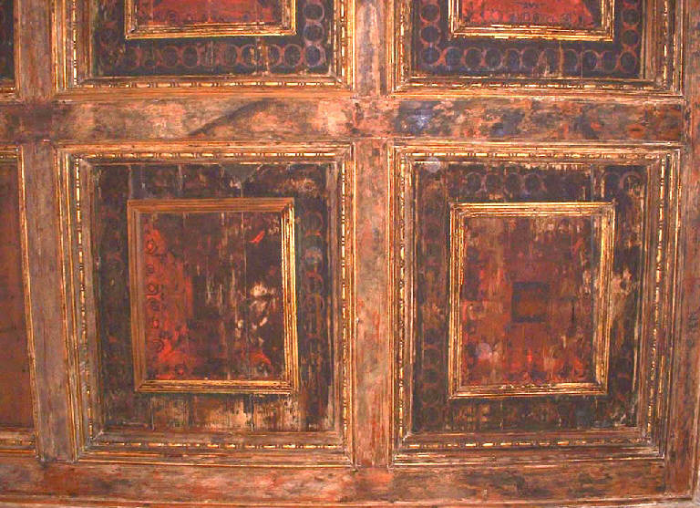 Soffitto ligneo a cassettoni conserva tracce della decorazione pittorica e delle dorature. La pittura attribuisce alla struttura un illusorio rivestimento lapideo.