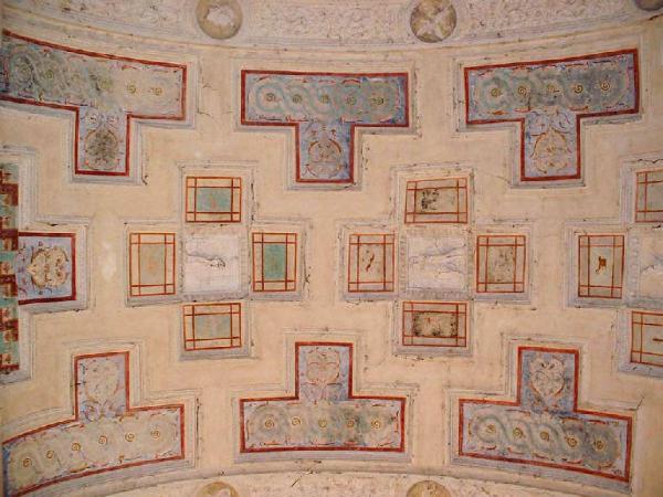 La volta a botte è divisa in tre campate da fasce corrispondenti alle lesene delle pareti. Presenta una decorazione con stucchi e dipinti nei fondali dei lacunari. Nelle specchiature perimetrali sono dipinti girali su fondo azzurro. Gerogrifici incorniciano i pannelli, a croce greca, con le Muse.