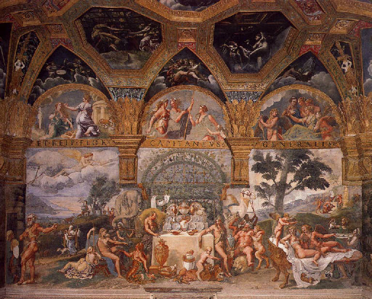 - NOTIZIE STORICO CRITICHE Nel giugno 1526 Federico Gonzaga ordina duecento pennelli per "lavorare a oglio" (AA.VV., Giulio Romano. Repertorio di fonti documentarie, 1992, p.154). In una lettera del 31 agosto 1528 Giulio Romano scrive: "Si sequita la camera delli Venti e lo camerone, Rinaldo et mi" (AA.VV., Giulio Romano. Repertorio di fonti documentarie, 1992, p.291). Le iscrizioni all'imposta della volta e sopra il camino definiscono Federico Gonzaga, quinto marchese di Mantova, capitano generale della Chiesa e della Repubblica Fiorentina, e quindi sono anteriori all'agosto del 1528.